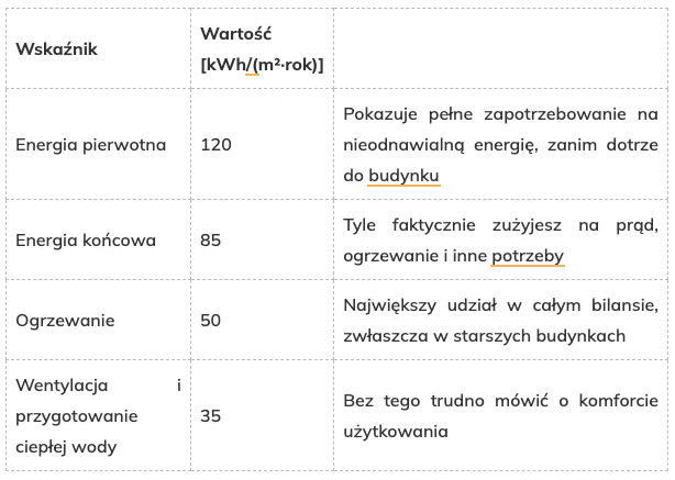 Nie podaje gotowej kwoty, ale pozwala obliczyć, jakie będzie zużycie energii na ogrzewanie, wentylację i przygotowanie ciepłej wody. Na tej podstawie łatwo oszacować rachunki. Wystarczy pomnożyć podane wskaźniki przez powierzchnię budynku.